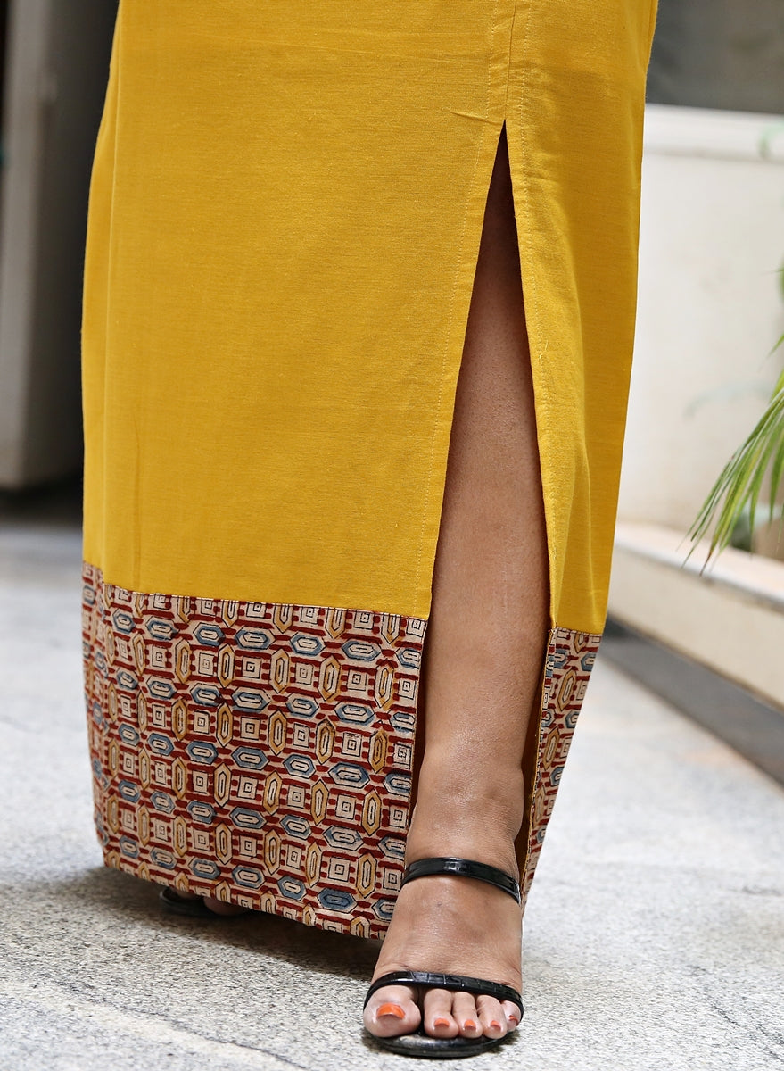 Mogra Yellow Handloom Cotton Maxi Skirt With Block Printed Border